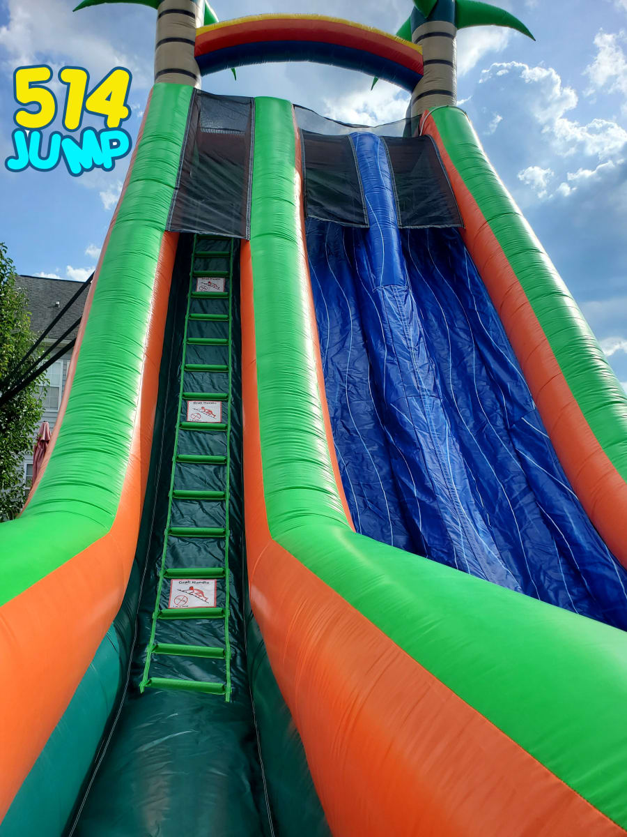 Description: The 27ft Tropical is the largest and most thrilling inflatable water slide in Charleston SC. This extreme 27 ft tall slide has two slide lanes with steep sliding angles that send you zooming all the way down to splash into the pool at the bottom. This high quality inflatable is made by the best manufacturer in the industry and is not only visually stunning but is designed with safety in mind, the two separate slide lanes allow 2 players at once to safely race to see who can splash into the pool at the bottom first.