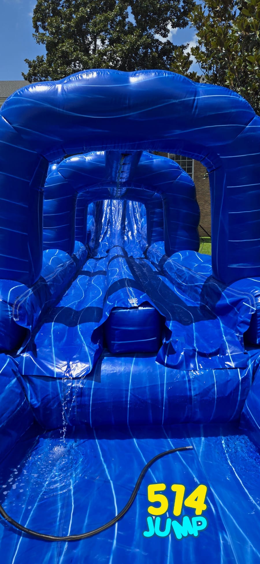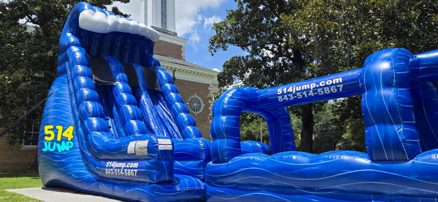 Description: This amazing slide is 22 ft tall and consists of two inflatables that connect together to make a giant 56 ft long slide. Like the original Bermuda Blast this version is simply a blue marble color theme and is still one of the largest and most thrilling inflatable water slides in Charleston SC. The Blue Crush features a radical sliding angle that's sure to get the adrenaline pumping as riders scream down. Riders continue down the long slip n slide before splashing into the pool at the end. This high quality inflatable is not only visually stunning but is designed with safety in mind, the two separate slide lanes allow 2 players at once to safely race to see who can splash into the pool at the bottom first.