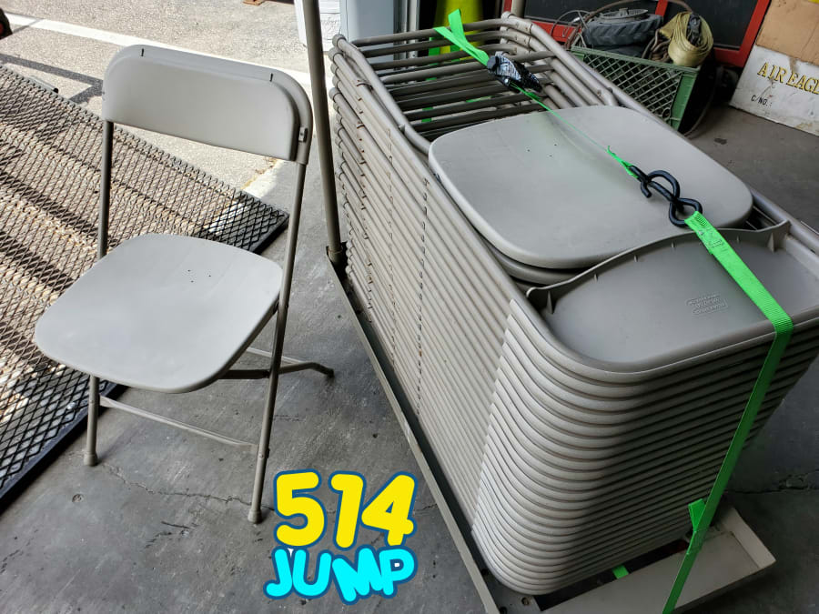 Standard style folding chairs in Beige color. Metal frame with plastic seat and plastic back. Stack of 24 chairs delivered on rolling cart.