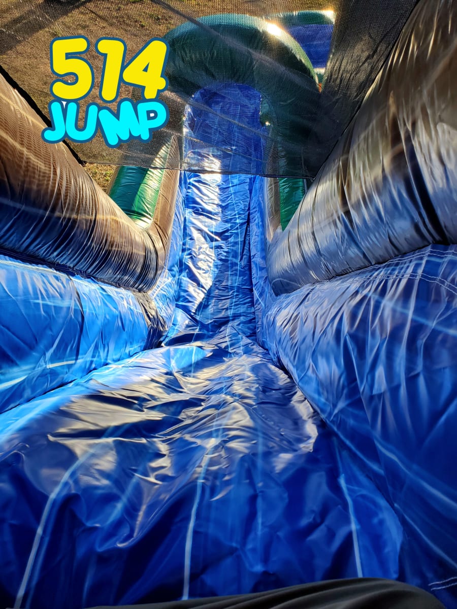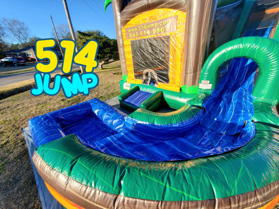 Description: 514-Jump has become the #1 source for the best inflatable water slides in the Lowcountry and brand new for the 2022 water slide rental season is the Paradise Palms Jump and Splash combo! We have had many requests for jumper and water slide combos and to address the problem of the bounce area getting too slippery once it gets wet we are responding with this innovative inflatable that has specially built heavy duty non skid material on the entrance ramp and on the entire jumping mattress virtually preventing players from slipping. The 15'L x 10'W bouncer has a basketball hoop inside and with the pool attached players can bounce, climb up the ladder and push off onto the 32' long sliding lane whipping around a 90° turn and splashing down into the pool at the bottom. This high quality inflatable is visually stunning and designed with safety in mind, the 514Jump crew will perform an expert setup and you and your guest will be all smiles with the Paradise Palms Jump and Splash combo at your party.
