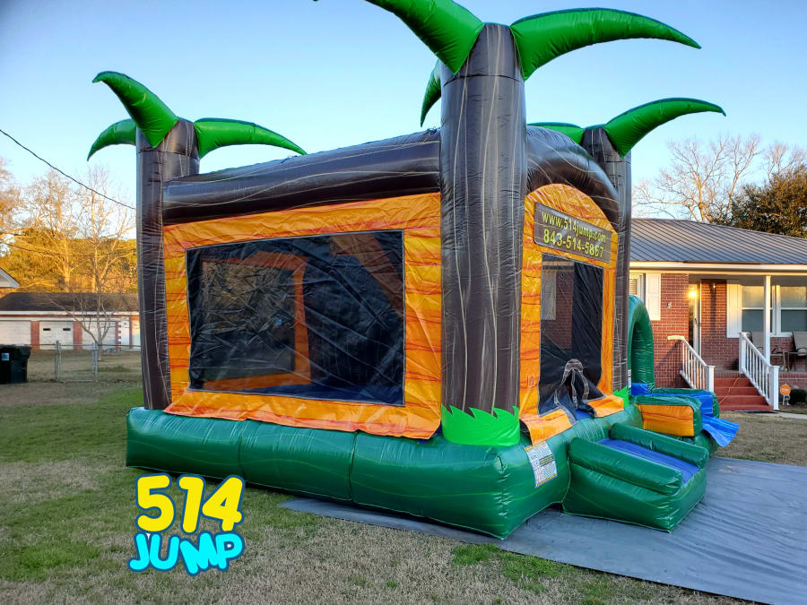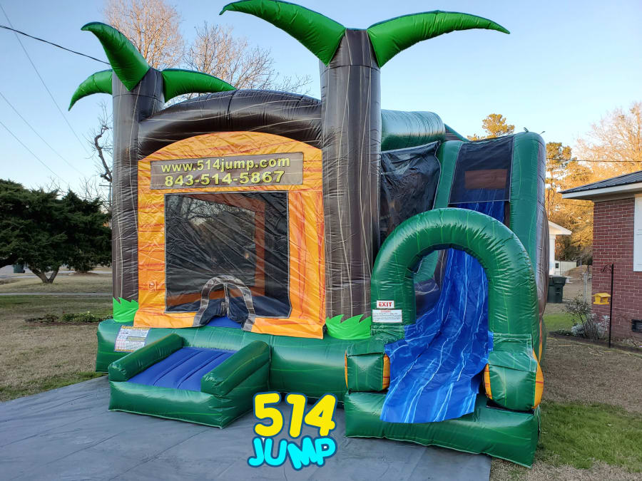 Description: 514-Jump is the #1 source for the best inflatables in the Lowcountry and brand new for the 2022 rental season is the Paradise Palms 4-in-1 combo! This bouncer combo has a basketball hoop built in so players can shoot hoops, bounce, climb up the ladder and zoom down the slide and out the bottom.