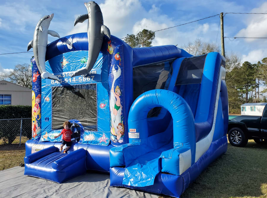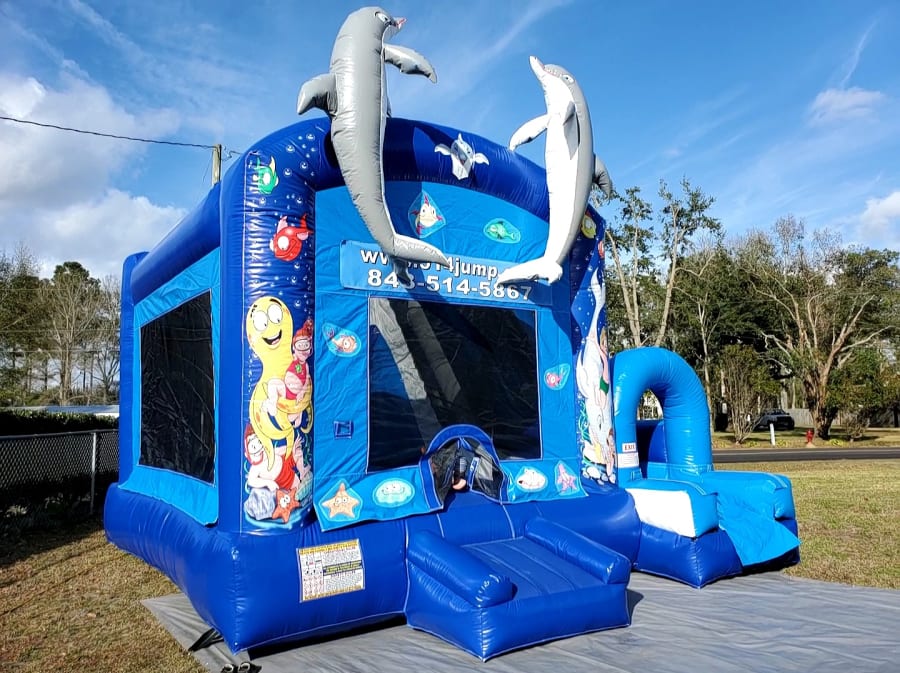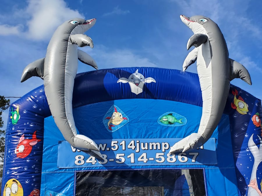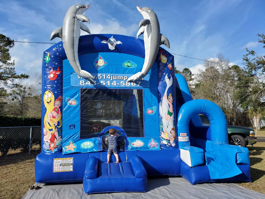 Description: 514-Jump is the #1 source for the best inflatables in the Lowcountry and brand new for the 2022 rental season is the Underwater Adventure themed 4-in-1 combo! This bouncer combo has a basketball hoop so players can shoot hoops, bounce, climb up the ladder and zoom down the sliding lane to the bottom. This high quality inflatable is visually stunning and designed with safety in mind, the 514Jump crew will perform an expert setup and you and your guest will be all smiles with the Underwater Adventure 4-in-1 combo at your party.