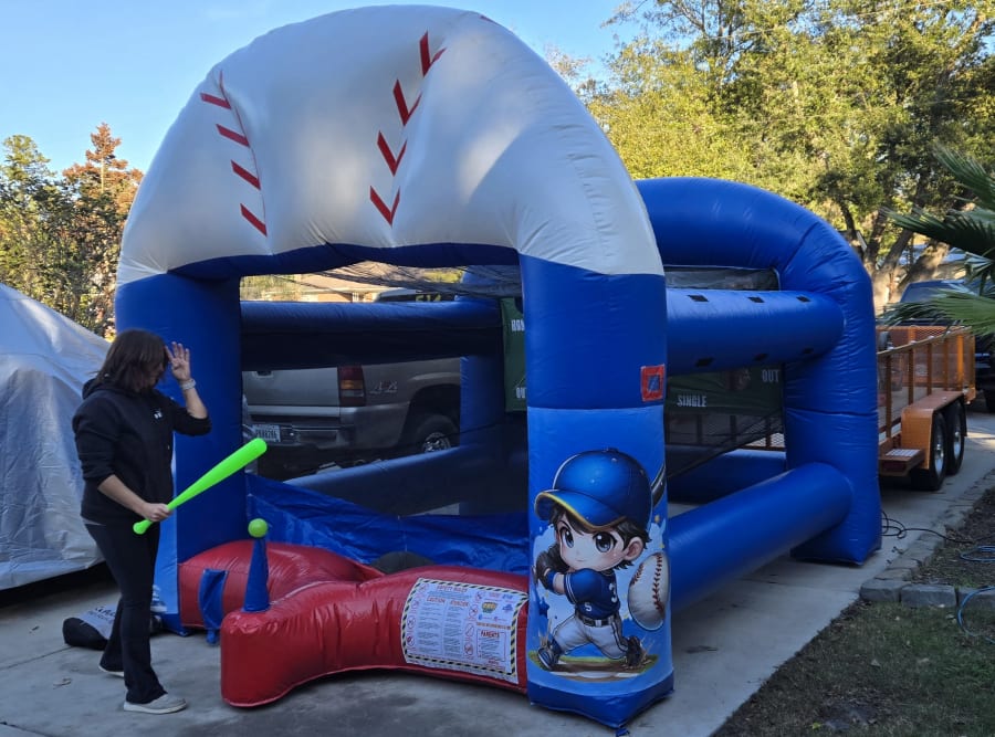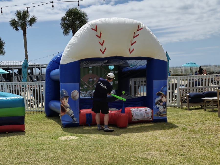 Description: This inflatable game uses plastic balls that float on a stream of air for players to hit with a plastic bat. The object of the game is to hit the ball into one of the holes to score points. 1 player at a time for children or adults.