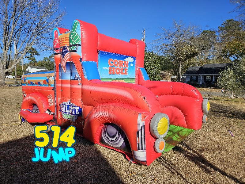 Description: Bring the tailgate vibe to any event with our brand new Tailgate Party inflatable – a fun, eye-catching inflatable shaped like a classic retro pickup truck! This vibrant, all-in-one game unit is perfect for birthdays, backyard parties, corporate events, tailgates, school functions, and any gathering where people want interactive entertainment. The design alone turns heads, but the real fun comes from the two built-in tossing games: classic party cup and cornhole – both perfect for friendly competition and laughs. The front of the truck features a corn hole art panel with bean bags and the rear of the truck features a party cup art panel with white tennis balls.