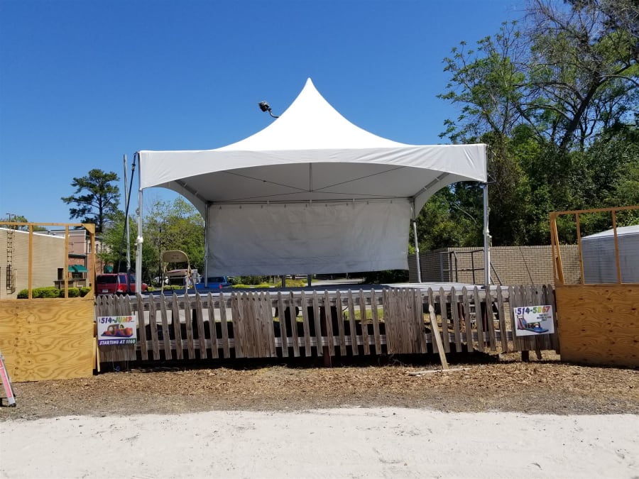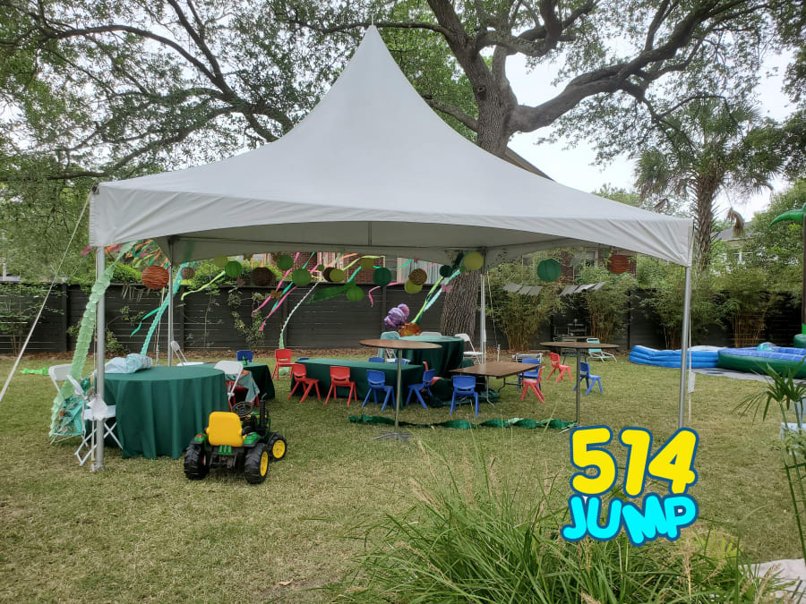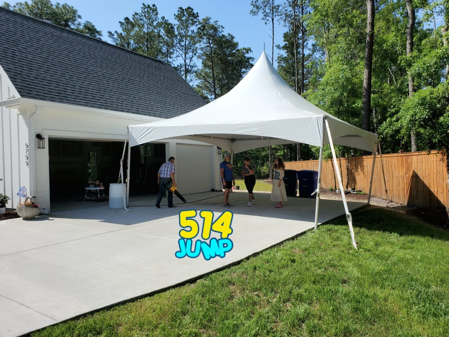 This high peak tent uses only the 4 corner poles and cables to raise the canopy so you get a 400 sq ft clear span covered area to protect from sun or rain. The heavy white sun block vinyl canopy provides full shade even under direct bright sunlight. The cables used to raise the canopy also create a handy location to hang streamers, lights or even a small fan.