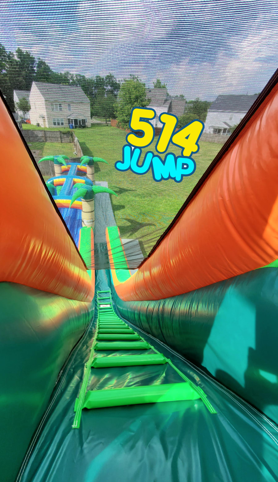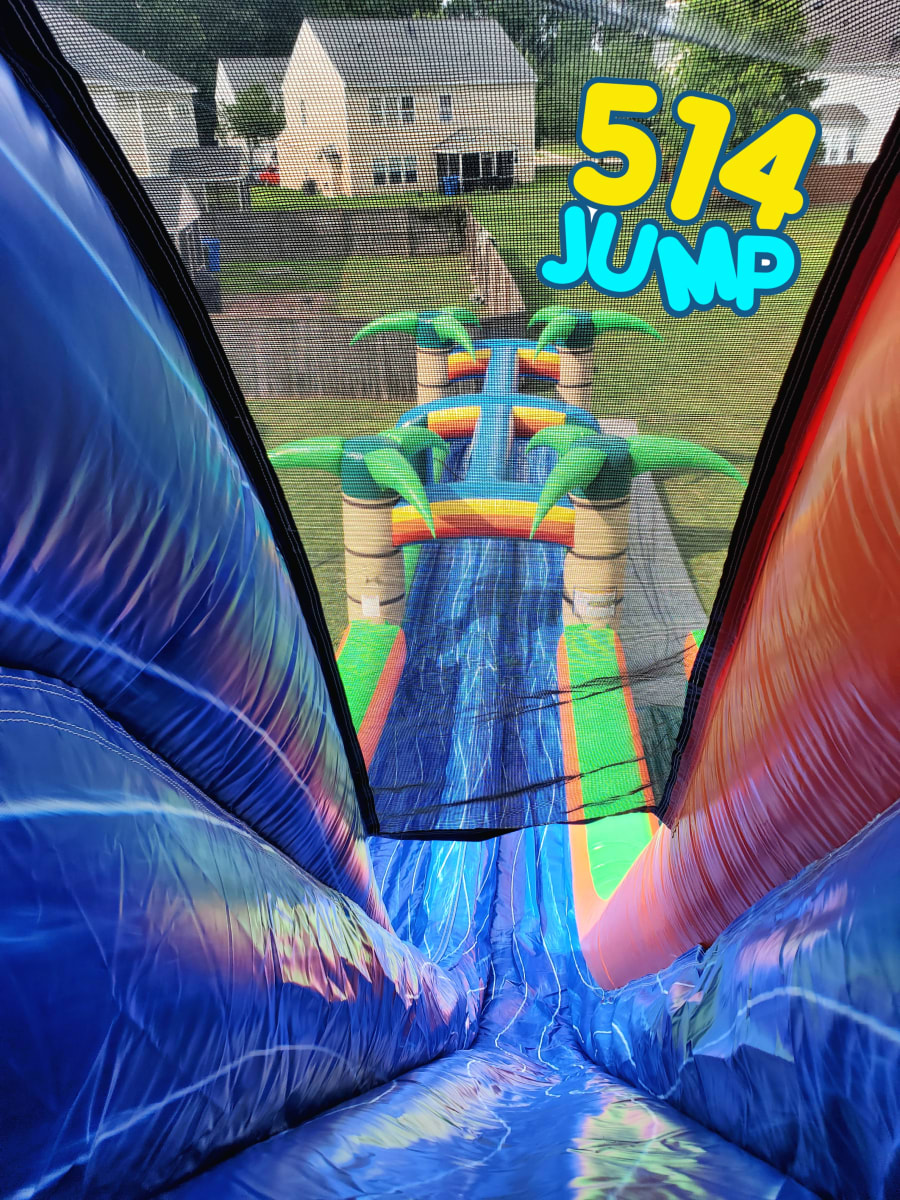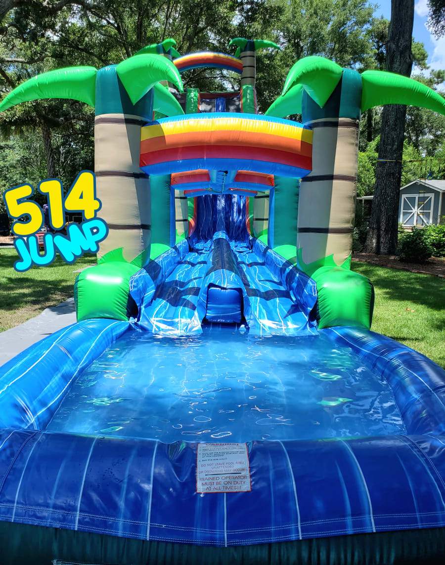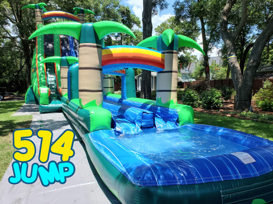 Description: The 27ft Tropical is the largest and most thrilling inflatable water slide in Charleston SC. This extreme 27 ft tall slide has two slide lanes with steep sliding angles that send you zooming all the way down to splash into the pool at the bottom. This high quality inflatable is made by the best manufacturer in the industry and is not only visually stunning but is designed with safety in mind, the two separate slide lanes allow 2 players at once to safely race to see who can splash into the pool at the bottom first.