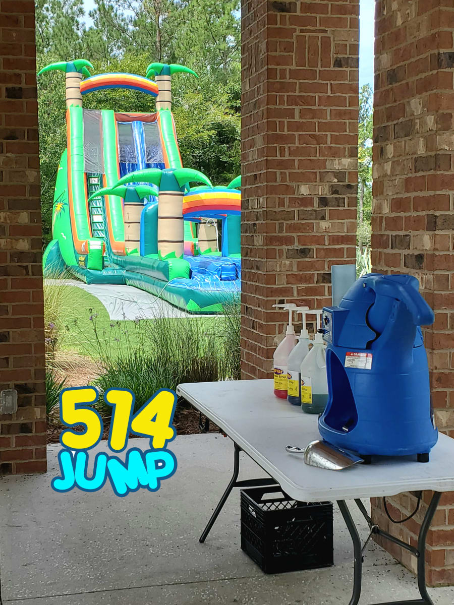 During setup the pool is filled up first and then your water hose is connected to the built in misting system that showers water down from the top and along the entire length of the bottom slip n slide to keep the slide slippery and wet and riders smoothly sliding all the way into the pool at the end. The 27ft Tropical has been a very popular rental all over Charleston, Dorchester, and Berkeley counties at gatherings of all kinds so we recommend that you schedule early as bookings are often taken several weeks or more in advance. This slide is loads of fun and will surely be a huge hit at any birthday party, school, church, or summer camp.