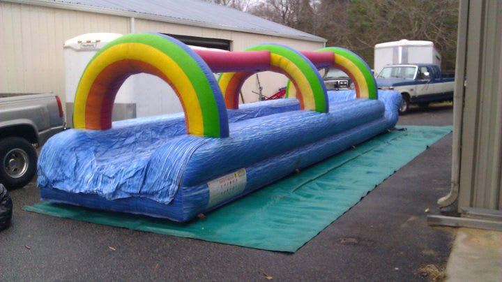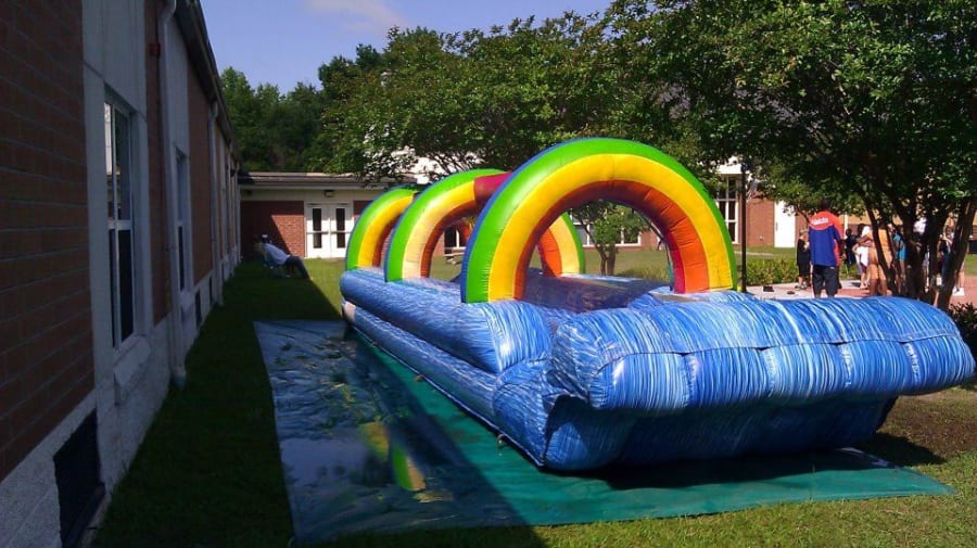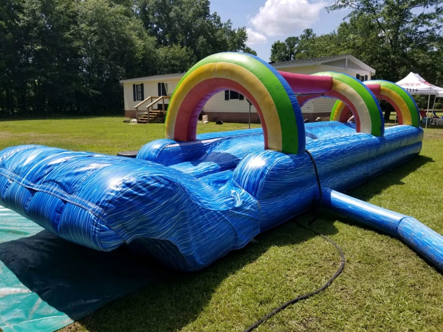 Description: This run and dive slip n slide has proven to be a very fun time for guests at parties and events all over Charleston, Dorchester and Berkeley counties in SC. A quick run to build up some speed and then dive onto the inflated slide lane and you're slipping and sliding all the way down to the big wave at the end that keeps you from sliding off into the grass. Your water hose connects to a built in drip hose and keeps the slide wet and slippery during use. When we arrive and setup there is no pool to fill so it's a quick setup and your party can begin using the slide right away. Book now for your next party or event in Summerville, James Island, Moncks Corner or anywhere in Charleston, Dorchester or Berkeley counties in SC.