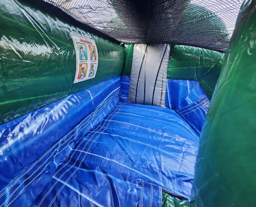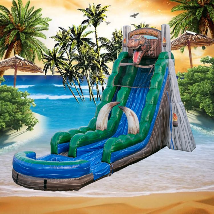 Description: Dive into the prehistoric thrill with our newest addition, the 22ft tall Jurassic Rush inflatable water slide! 🦖 Made in the USA, this exhilarating adventure features a spectacular 3D T-Rex perched atop the slide, ready to take your event to the next level. 🌊 Glide down the single lane with pure excitement, thanks to the built-in drip hose at the top keeping the slide delightfully slippery. 💦 The fun culminates in a splash-worthy finale in the refreshing pool at the bottom. Perfect for hot summer days or any celebration, the Jurassic Rush guarantees roaring fun for all ages. Make a splash at your next event with this towering inflatable centerpiece from 514jump.com! 🎉
