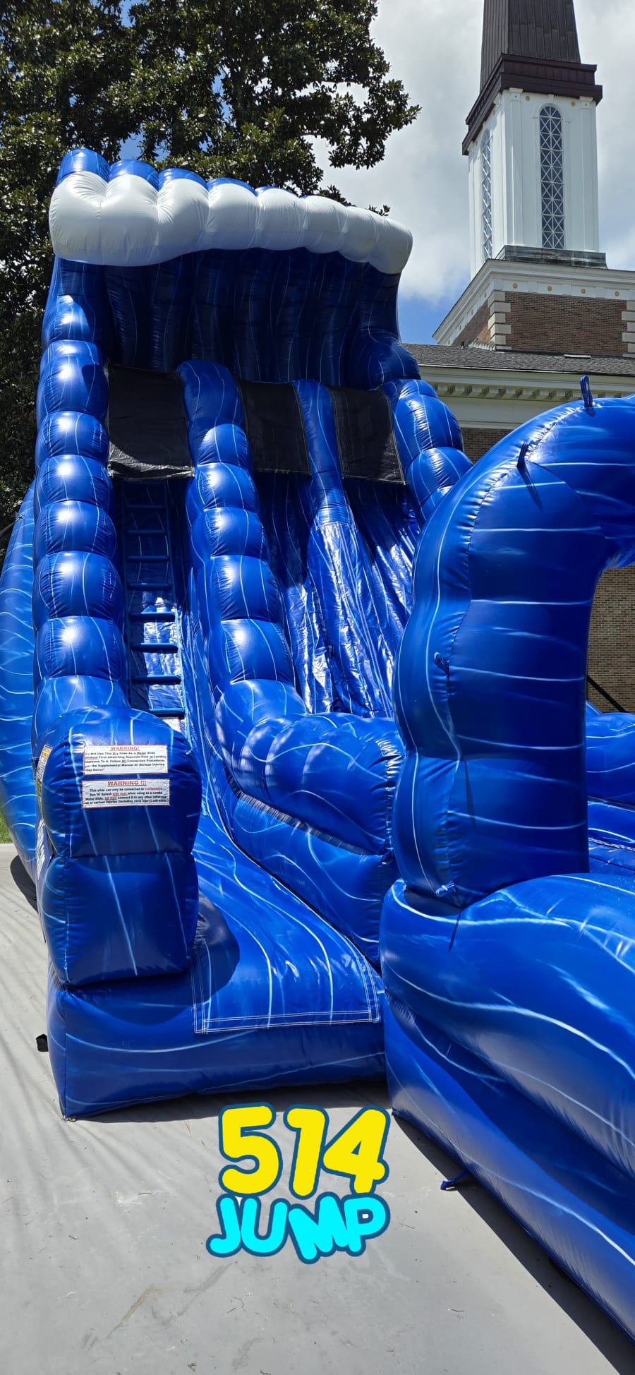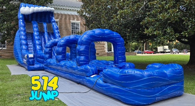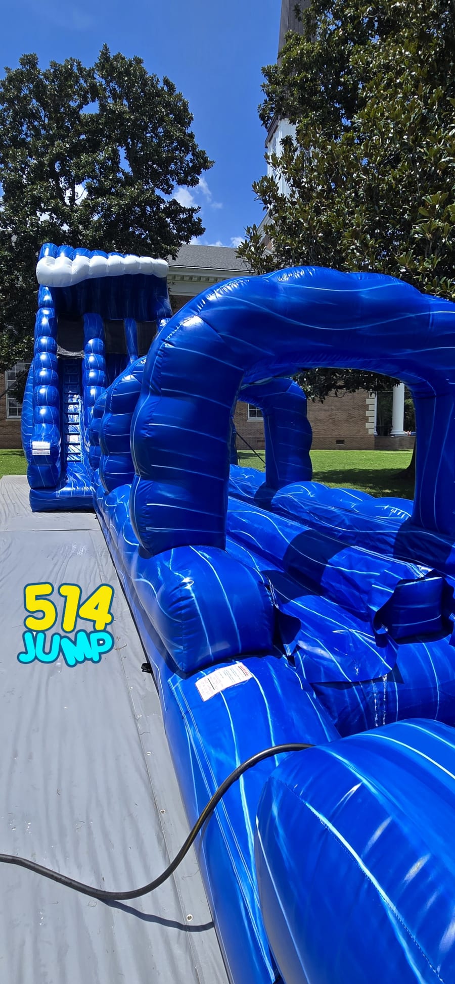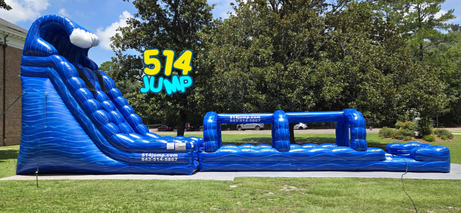 Description: This amazing slide is 22 ft tall and consists of two inflatables that connect together to make a giant 56 ft long slide. Like the original Bermuda Blast this version is simply a blue marble color theme and is still one of the largest and most thrilling inflatable water slides in Charleston SC. The Blue Crush features a radical sliding angle that's sure to get the adrenaline pumping as riders scream down. Riders continue down the long slip n slide before splashing into the pool at the end. This high quality inflatable is not only visually stunning but is designed with safety in mind, the two separate slide lanes allow 2 players at once to safely race to see who can splash into the pool at the bottom first.