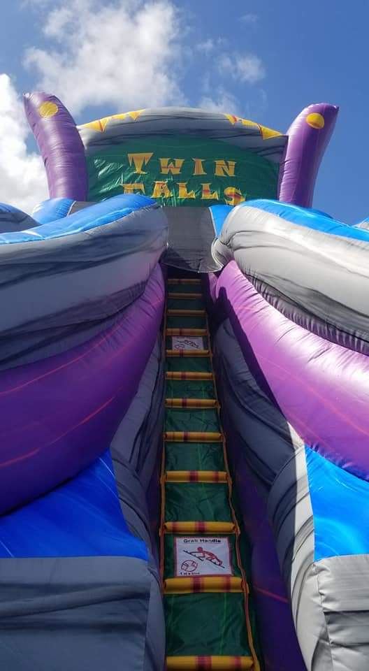 Description: This extreme 22 ft tall slide has two sliding lanes with a spiral design that sends you zooming all the way down and ends with a splash into two separate pools at the bottom. This slide is loads of fun and will surely be a huge hit at any birthday party, school, church, or summer camp. This made in USA inflatable is not only visually stunning but is also designed with safety in mind. Two slide lanes and 2 separate pools allow 2 players at once to safely race each other to see who can splash into the pool at the bottom first. During setup the pools are filled up first and then your water hose is connected to a built in misting system on the slide that drips water down at the top of each lane keeping the slide wet and slippery and riders plummeting down and splashing into the pools at the bottom.